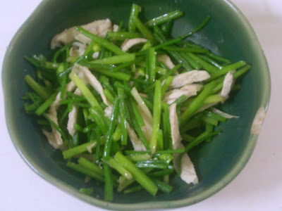 爆香薑絲,把韭菜花放入,再加入雞絲拌炒,加適量鹽巴調味就完成囉
